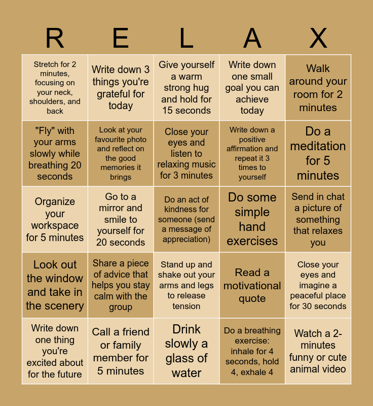 This bingo card has 25 words: Share a piece of advice that helps you stay calm with the group, Drink slowly a glass of water, Close your eyes and listen to relaxing music for 3 minutes, Write down one thing you're excited about for the future, Walk around your room for 2 minutes, Stretch for 2 minutes, focusing on your neck, shoulders, and back, "Fly" with your arms slowly while breathing 20 seconds, Write down 3 things you're grateful for today, Do some simple hand exercises, Stand up and shake out your arms and legs to release tension, Write down a positive affirmation and repeat it 3 times to yourself, Organize your workspace for 5 minutes, Read a motivational quote, Close your eyes and imagine a peaceful place for 30 seconds, Look at your favourite photo and reflect on the good memories it brings, Watch a 2-minutes funny or cute animal video, Send in chat a picture of something that relaxes you, Give yourself a warm strong hug and hold for 15 seconds, Do a meditation for 5 minutes, Go to a mirror and smile to yourself for 20 seconds, Do an act of kindness for someone (send a message of appreciation), Call a friend or family member for 5 minutes, Look out the window and take in the scenery, Write down one small goal you can achieve today and Do a breathing exercise: inhale for 4 seconds, hold 4, exhale 4.