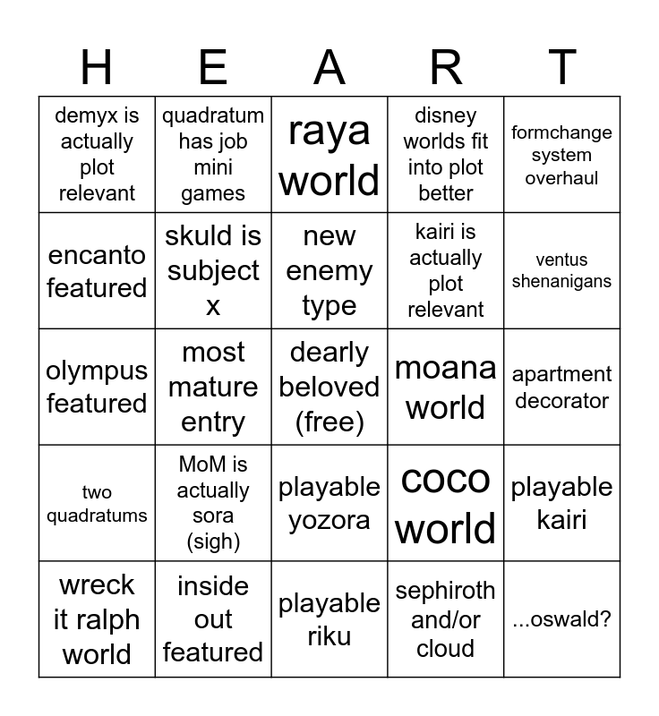 This bingo card has a free space and 24 words: MoM is actually sora (sigh), inside out featured, new enemy type, wreck it ralph world, formchange system overhaul, demyx is actually plot relevant, encanto featured, quadratum has job mini games, moana world, playable yozora, kairi is actually plot relevant, olympus featured, coco world, playable kairi, skuld is subject x, sephiroth and/or cloud, apartment decorator, raya world, ventus shenanigans, most mature entry, ...oswald?, two quadratums, disney worlds fit into plot better and playable riku.