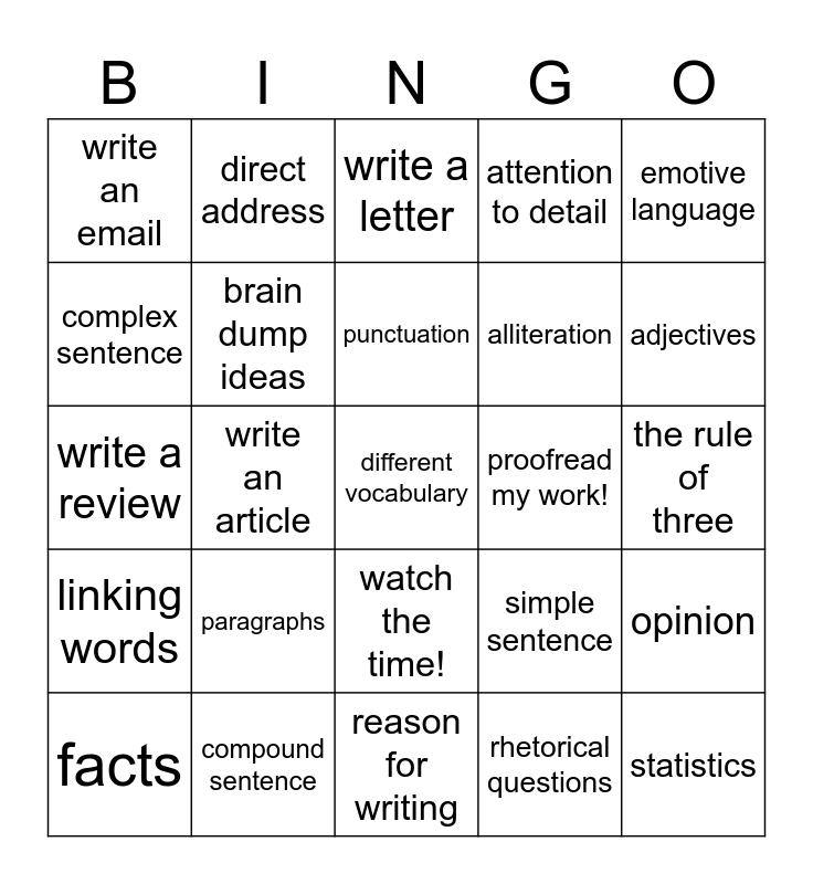 This bingo card has a free space and 24 words: paragraphs, compound sentence, punctuation, facts, emotive language, write an email, complex sentence, direct address, proofread my work!, watch the time!, alliteration, write a review, simple sentence, opinion, brain dump ideas, rhetorical questions, the rule of three, write a letter, adjectives, write an article, statistics, linking words, attention to detail and reason for writing.