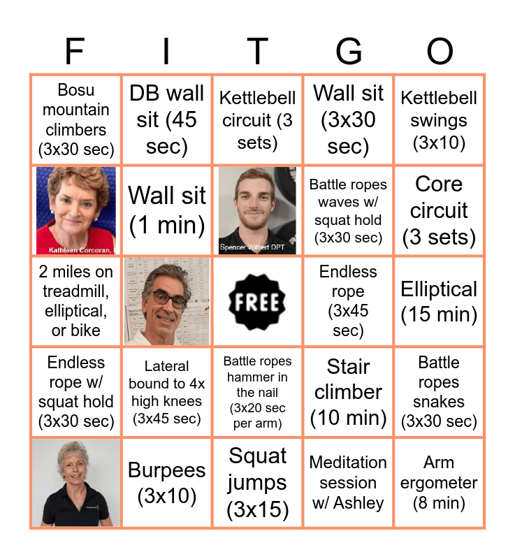 This bingo card has 10 images, a free space and 64 words: Full body circuit (3 sets), DB lower body circuit (3 sets), Kettlebell circuit (3 sets), Bosu circuit (3 sets), DB upper body circuit (3 sets), TRX circuit (3 sets), Mini band circuit (3 sets), Core circuit (3 sets), Get 10,000+ steps in 1 day, 2 miles on treadmill, elliptical, or bike, Wall sit (1 min), DB wall sit (45 sec), Wall sit (3x30 sec), DB wall sit (2x30 sec), Arm ergometer (8 min), Play Fish Game on Concept II rower, Rowing machine (1x2000 meters), Rowing machine (2x1000 meters), Rowing machine (3x500 meters), Cardio - your choice (20 min), Kettlebell swings (3x10), Kettlebell swings (3x12), Kettlebell swings (3x15), Max trainer (10 min), Max trainer (15 min), Meditation session w/ Ashley, Blood pressure check @ Health Center, Full body stretching (10 min), Squat jumps (3x10), Squat jumps (3x12), Squat jumps (3x15), Burpees (3x10), Burpees (3x12), Burpees (3x15), Mountain climbers (3x30 sec), Bosu mountain climbers (3x30 sec), Lateral bound to 4x high knees (3x30 sec), Lateral bound to 4x high knees (3x45 sec), Rolling Hills program on any cardio machine (15 min), Cardio - your choice (15 min), Bike (15 min), Bike (20 min), Elliptical (15 min), Elliptical (20 min), Battle ropes waves (3x30 sec), Battle ropes alt. waves (3x30 sec), Battle ropes hammer in the nail (3x20 sec per arm), Battle ropes slams (3x30 sec), Battle ropes side slams (3x30 sec), Battle ropes snakes (3x30 sec), Battle ropes waves w/ squat hold (3x30 sec), Battle ropes S/A slams (3x30 sec), Endless rope w/ squat hold (3x30 sec), Endless rope (3x30 sec), Endless rope (3x45 sec), Medball ground to press (3x30 sec), Medball slams (3x30 sec), Medball overhead jacks (3x30 sec), Stair climber (10 min), Stair climber (15 min), AZ group exercise class or PT (30-60 min), Foam rolling (10 min), Jumping jacks (3x30 sec) and Skater hops (3x30 sec).