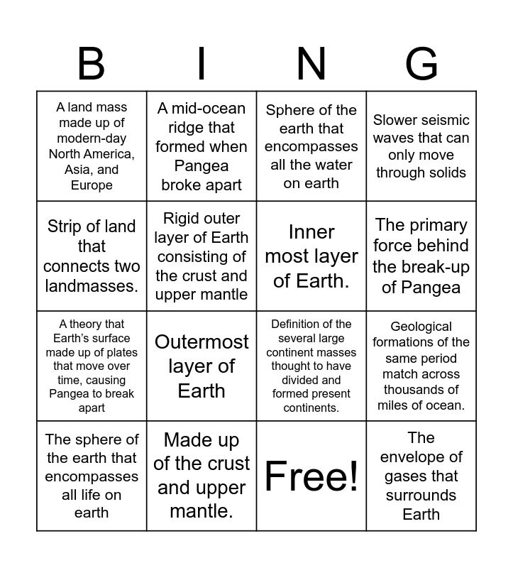 This bingo card has 26 words: Credited with the hypothesis of continental drift., Proposed that Earth was created with slow, gradual processes, The primary force behind the break-up of Pangea, A land mass made up of modern-day South America, Africa, Antarctica, and Australia, Strip of land that connects two landmasses., A land mass made up of modern-day North America, Asia, and Europe, Rigid outer layer of Earth consisting of the crust and upper mantle, A mid-ocean ridge that formed when Pangea broke apart, Free!, A supercontinent that existed millions of years ago consisting of all the continents, A theory that Earth’s surface made up of plates that move over time, causing Pangea to break apart, Definition of the several large continent masses thought to have divided and formed present continents., Continents seem to fit together like puzzle pieces., Evidence of species being found on different continents., Geological formations of the same period match across thousands of miles of ocean., Fast, seismic waves that can travel through solid and liquid, Slower seismic waves that can only move through solids, The envelope of gases that surrounds Earth, Sphere of the earth that encompasses all the water on earth, The sphere of the earth that encompasses all life on earth, Outermost layer of Earth, Glacial ages and climate evidence., Made up of the crust and upper mantle., Lies below the lithosphere., Inner most layer of Earth. and Thickest layer of Earth..