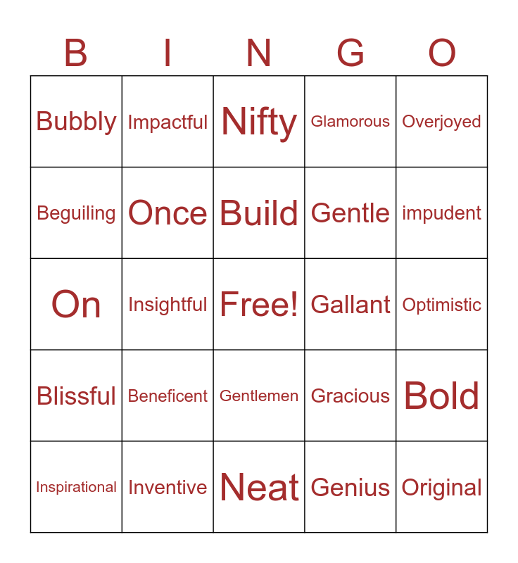 This bingo card has a free space and 49 words: Beautiful, Ideal, Nice, Genius, Optimistic, Brave, Impactful, Noble, Gentle, Observant, Beguiling, Insightful, Gracious, Original, Brilliant, Intelligent, Nifty, Gallant, Outstanding, Bubbly, Inventive, Neat, Glamorous, Overjoyed, Breathtaking, Beneficent, Build, Bursting, Bold, Blissful, Boutiful, Gentlemen, Best, Bedazzle, Inspirational, Inviting, Ingenious, Include, impudent, Nimble, Nonpareil, Noteworthy, Novel, Nourishing, On, Once, October, Over and Olive.