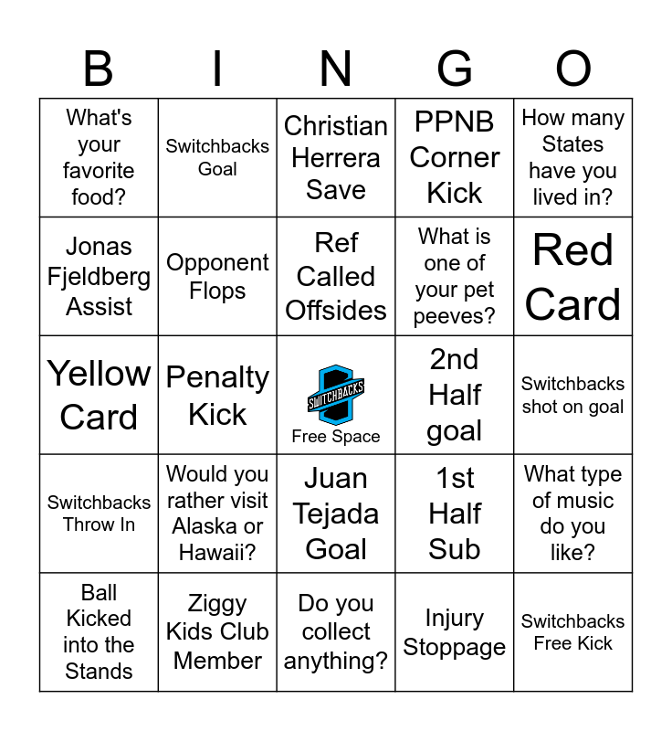 This bingo card has a free space and 24 words: Ball Kicked into the Stands, Would you rather visit Alaska or Hawaii?, Ref Called Offsides, Injury Stoppage, How many States have you lived in?, What's your favorite food?, Switchbacks Goal, Christian Herrera Save, 2nd Half goal, Switchbacks shot on goal, Yellow Card, Opponent Flops, 1st Half Sub, What type of music do you like?, Jonas Fjeldberg Assist, Ziggy Kids Club Member, Do you collect anything?, PPNB Corner Kick, Red Card, Switchbacks Throw In, Penalty Kick, Juan Tejada Goal, What is one of your pet peeves? and Switchbacks Free Kick.