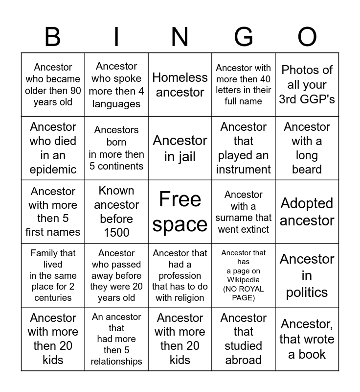 This bingo card has a free space and 24 words: Ancestor who passed away before they were 20 years old, An ancestor that had more then 5 relationships, Ancestor in jail, Ancestor with more then 20 kids, Photos of all your 3rd GGP's, Ancestor who became older then 90 years old, Ancestor who died in an epidemic, Ancestor who spoke more then 4 languages, Ancestor with a surname that went extinct, Ancestor that had a profession that has to do with religion, Ancestor that played an instrument, Ancestor with more then 5 first names, Ancestor that has a page on Wikipedia (NO ROYAL PAGE), Ancestor in politics, Ancestors born in more then 5 continents, Ancestor that studied abroad, Adopted ancestor, Homeless ancestor, Ancestor with a long beard, Known ancestor before 1500, Ancestor, that wrote a book, Family that lived in the same place for 2 centuries, Ancestor with more then 40 letters in their full name and Ancestor with more then 20 kids.