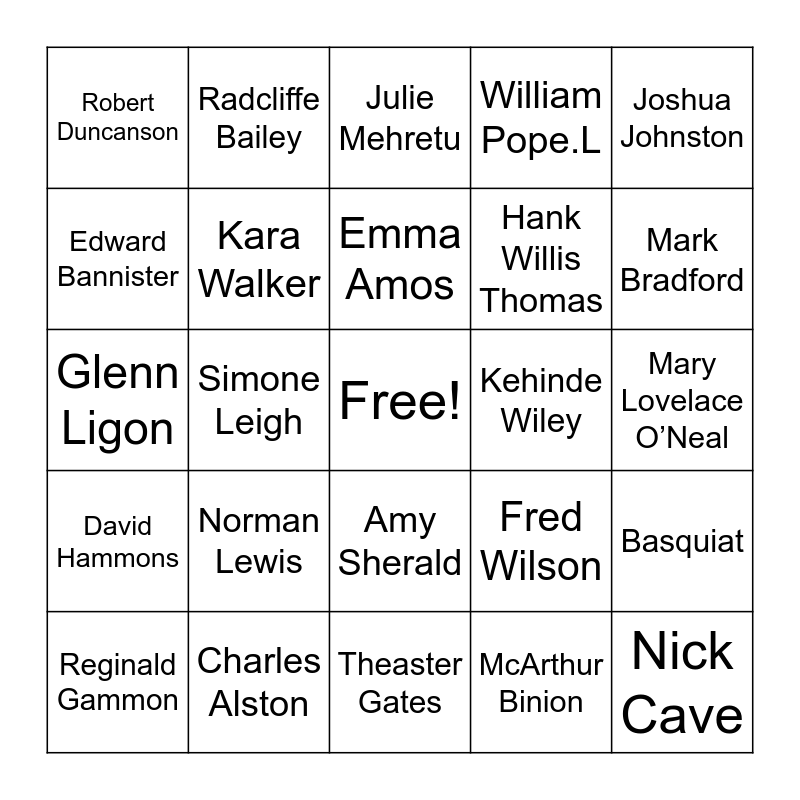 This bingo card has a free space and 24 words: Norman Lewis, Charles Alston, Emma Amos, Reginald Gammon, Joshua Johnston, Robert Duncanson, Edward Bannister, Radcliffe Bailey, Kehinde Wiley, Amy Sherald, Hank Willis Thomas, Glenn Ligon, Fred Wilson, Basquiat, Kara Walker, McArthur Binion, Mary Lovelace O’Neal, Julie Mehretu, Mark Bradford, Simone Leigh, Nick Cave, David Hammons, William Pope.L and Theaster Gates.