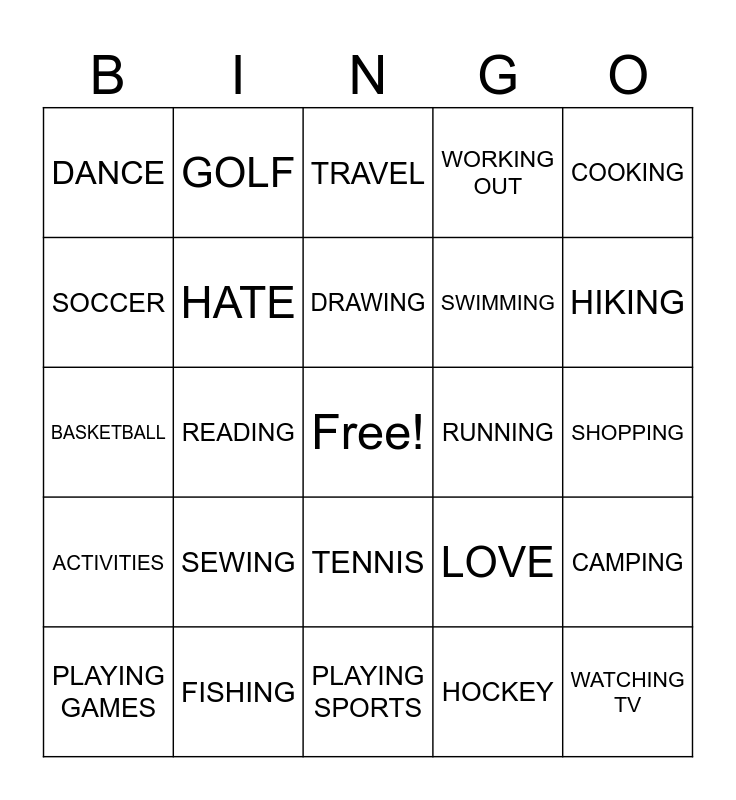 This bingo card has a free space and 36 words: LIKE, DON'T-LIKE, INTERESTING, HATE, LOVE, ACTIVITIES, DRAWING, PHOTOGRAPHY, COOKING, MUSIC, READING, WORKING OUT, WALKING, RUNNING, HIKING, DANCE, CHATTING, SEWING, WATCHING TV, TRAVEL, SHOPPING, CAMPING, FISHING, PLAYING GAMES, PLAYING SPORTS, GOLF, BASKETBALL, BASEBALL, SWIMMING, SOCCER, FOOTBALL, VOLLEYBALL, HOCKEY, TENNIS, BIKING and WHAT-DO?.