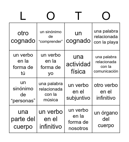 This bingo card has 16 words: un verbo en el infinitivo, otro verbo en el infinitivo, un cognado, otro cognado, un sinónimo de “personas”, un sinónimo de “comprender”, un verbo en el subjuntivo, un verbo en la forma de nosotros, un verbo en la forma de tú, un verbo en la forma de yo, una parte del cuerpo, una palabra relacionada con la playa, una palabra relacionada con la música, una palabra relacionada con la comunicación, una actividad física and un órgano del cuerpo.