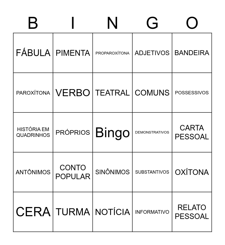 This bingo card has a free space and 26 words: SINÔNIMOS, INFORMATIVO, TEATRAL, TURMA, BANDEIRA, FÁBULA, PAROXÍTONA, PIMENTA, CARTA PESSOAL, SUBSTANTIVOS, COMUNS, HISTÓRIA EM QUADRINHOS, OXÍTONA, CERA, PRÓPRIOS, CONTO MARAVILHOSO, ADJETIVOS, ANTÔNIMOS, PROPAROXÍTONA, RELATO PESSOAL, POSSESSIVOS, NOTÍCIA, DEMONSTRATIVOS, CONTO POPULAR, VERBO and CAMA.