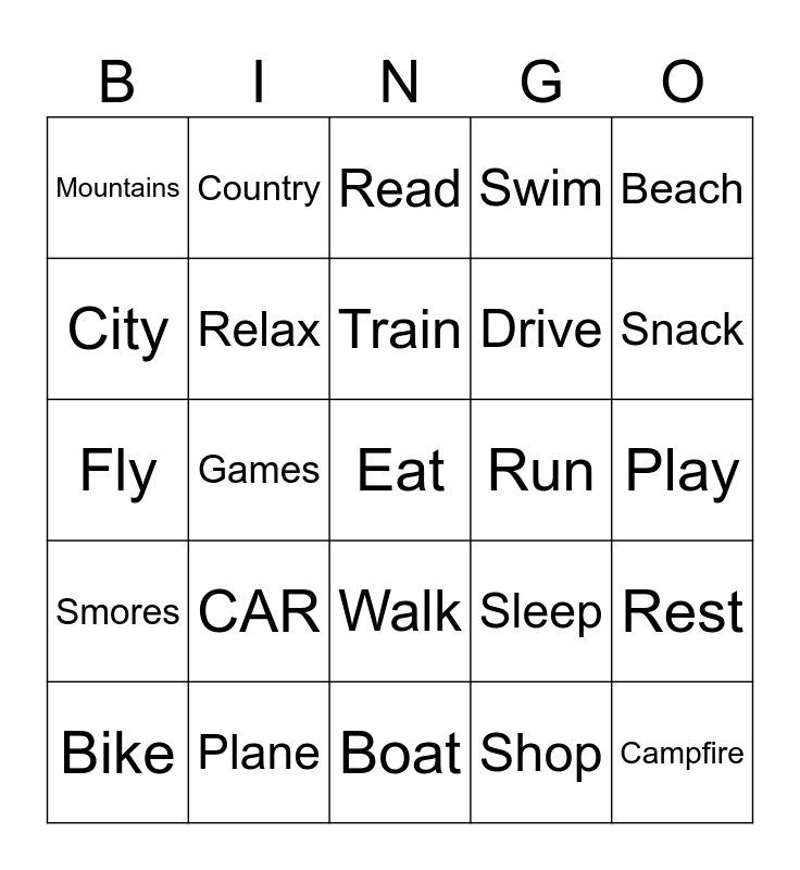This bingo card has a free space and 24 words: CAR, Plane, Train, Bike, Beach, Mountains, City, Country, Run, Walk, Drive, Fly, Sleep, Rest, Relax, Shop, Play, Read, Snack, Games, Campfire, Smores, Swim and Boat.