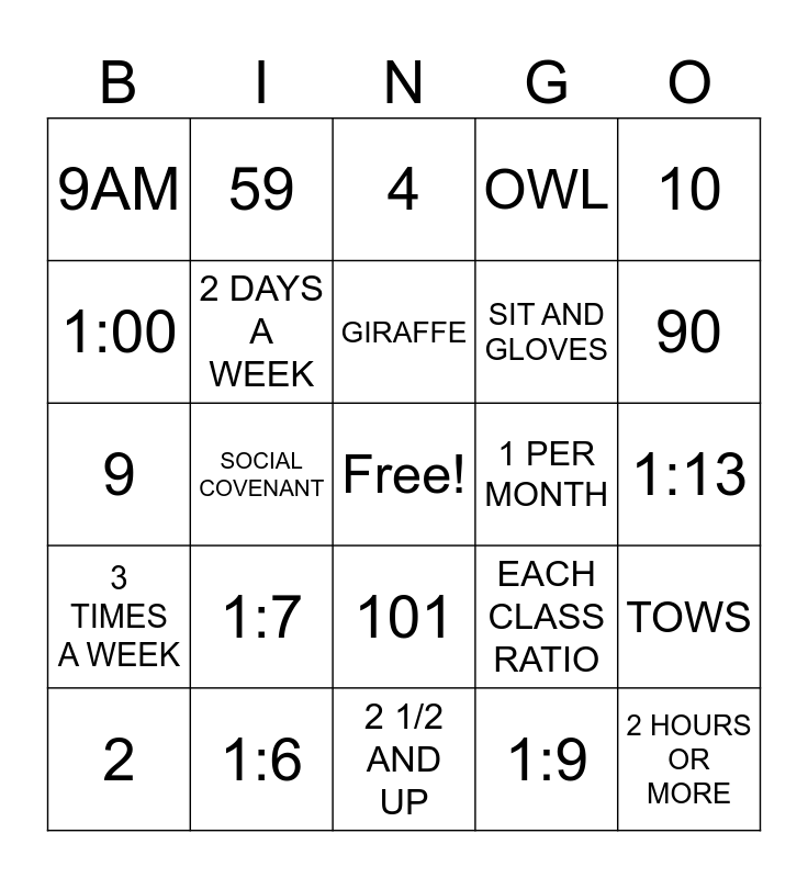 This bingo card has a free space and 24 words: 1:7, 1:6, GIRAFFE, 2, 10, 9AM, 1:00, 59, 1 PER MONTH, 101, SIT AND GLOVES, 9, EACH CLASS RATIO, TOWS, 2 DAYS A WEEK, 1:9, 1:13, 4, 90, SOCIAL COVENANT, 2 HOURS OR MORE, 3 TIMES A WEEK, OWL and 2 1/2 AND UP.