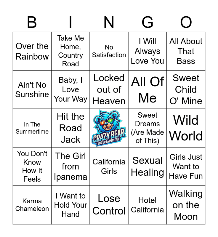 This bingo card has a free space and 52 words: Johnny B. Goode - 2002 Remaster, Walking on the Moon, So Good, Lose Control, The Girl from Ipanema, Papa Was a Rolling Stone, Take Me Home, Country Road, A Pirate Looks at 40, Ain't No Sunshine, Leaving On A Jetplane, Baby, I Love Your Way, Take on Me, Girls Just Want to Have Fun, Sexual Healing, My Girl - Reggae Style, Have You Ever Seen the Rain, Locked out of Heaven, Sweet Dreams (Are Made of This), Every Breath You Take, All About That Bass, Hit the Road Jack, Hotel California, Over the Rainbow, All Of Me, Nothing Compares 2 U, Careless Whisper, Easy, Somebody That I Used to Know, Sweet Child O' Mine, Rock the Casbah, I Wanna Know What Love Is, I Will Always Love You, Livin' La Vida Loca, Kiss From A Rose, I Walk The Line, No Satisfaction, I Want to Hold Your Hand, Hey Jude, Start Me Up, Proud Mary, Knockin' On Heaven'S Door, Wild World, You Don't Know How It Feels, Wonderful Tonight, California Girls, A Change Is Gonna Come, Rehab, In The Summertime, Crank That (Soulja Boy), In Da Club, Karma Chameleon and Party in the U.S.A.