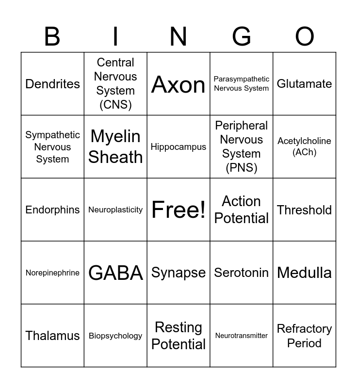 This bingo card has a free space and 30 words: Biopsychology, Neuroscience, Neuroplasticity, Neuron, Dendrites, Axon, Myelin Sheath, Synapse, Action Potential, Resting Potential, Threshold, Refractory Period, Neurotransmitter, Receptor Sites, Acetylcholine (ACh), Dopamine, Serotonin, Norepinephrine, GABA, Glutamate, Endorphins, Oxytocin, Central Nervous System (CNS), Peripheral Nervous System (PNS), Sympathetic Nervous System, Parasympathetic Nervous System, Medulla, Thalamus, Hippocampus and Amygdala.