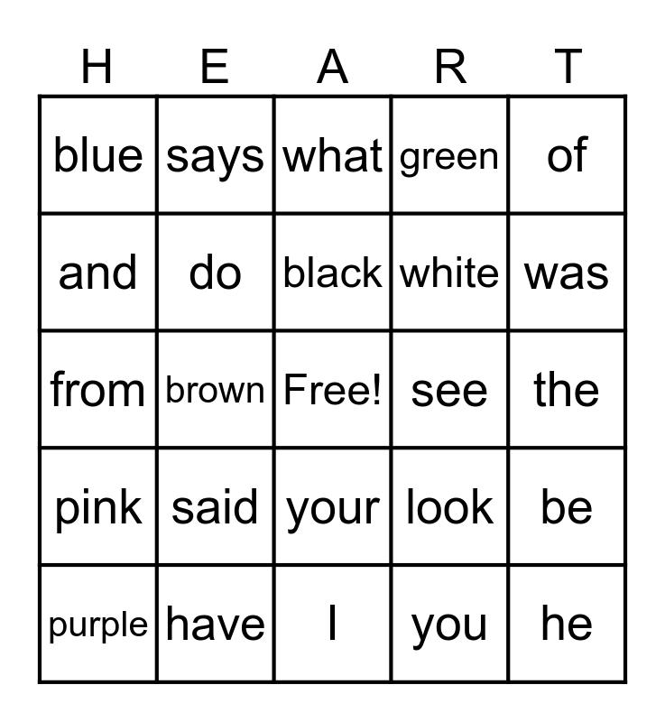 This bingo card has a free space and 36 words: red, orange, a, do, look, pink, black, is, of, book, brown, green, as, see, was, blue, yellow, said, he, what, the, be, have, purple, I, says, from, want, white, and, to, are, you, your, or and their.
