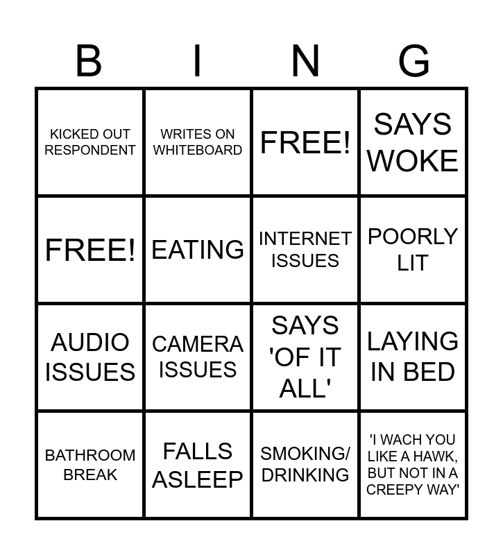 This bingo card has 16 words: FALLS ASLEEP, LAYING IN BED, FREE!, KICKED OUT RESPONDENT, AUDIO ISSUES, WRITES ON WHITEBOARD, SAYS 'OF IT ALL', SMOKING/ DRINKING, FREE!, EATING, BATHROOM BREAK, SAYS WOKE, CAMERA ISSUES, POORLY LIT, INTERNET ISSUES and 'I WACH YOU LIKE A HAWK, BUT NOT IN A CREEPY WAY'.