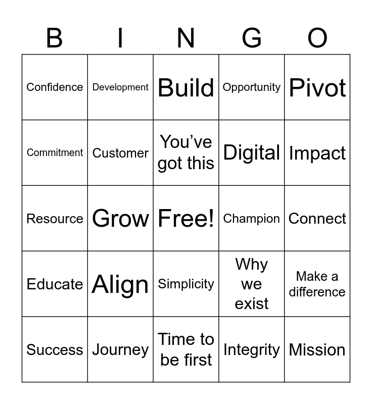 This bingo card has a free space and 24 words: Align, Journey, You’ve got this, Success, Pivot, Confidence, Commitment, Development, Champion, Simplicity, Digital, Resource, Why we exist, Make a difference, Customer, Integrity, Connect, Build, Impact, Grow, Mission, Educate, Opportunity and Time to be first.
