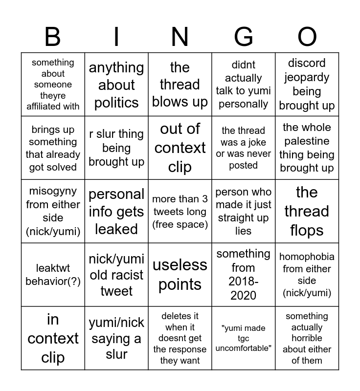 This bingo card has a free space and 24 words: nick/yumi old racist tweet, yumi/nick saying a slur, out of context clip, in context clip, discord jeopardy being brought up, something about someone theyre affiliated with, brings up something that already got solved, anything about politics, person who made it just straight up lies, useless points, the thread was a joke or was never posted, misogyny from either side (nick/yumi), something from 2018-2020, homophobia from either side (nick/yumi), r slur thing being brought up, "yumi made tgc uncomfortable", the thread flops, the thread blows up, the whole palestine thing being brought up, personal info gets leaked, something actually horrible about either of them, leaktwt behavior(?), didnt actually talk to yumi personally and deletes it when it doesnt get the response they want.
