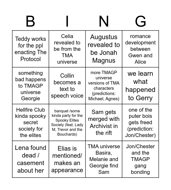 This bingo card has 16 words: Elias is mentioned/ makes an appearance, one of the puter bois gets freed (prediction: Jon/Chester), Augustus revealed to be Jonah Magnus, Teddy works for the ppl enacting The Protocol, Hellfire Club kinda spooky secret society for the elites, Celia revealed to be from the TMA universe, Sam gets merged with Archivist in the rift, TMA universe Basira, Melanie and Georgie find Sam, something bad happens to TMAGP universe Georgie, Collin becomes a text to speech voice, Lena found dead / casement about her, romance development between Gwen and Alice, banquet /some kinda party for the Spooky Elites Society (feat. Lady M, Trevor and the Bouchards), we learn what happened to Gerry, more TMAGP universe versions of TMA characters (predictions: Michael, Agnes) and Jon/Chester and the TMAGP gang bonding.