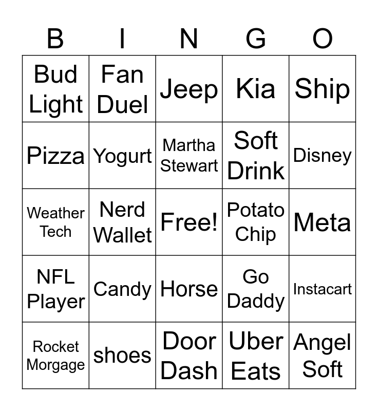 This bingo card has a free space and 35 words: pickleball, Taco Bell, Tubi, Yogurt, Horse, Kia, Pizza, Duracell, Martha Stewart, Bosch, Weather Tech, Ship, Coors, Mayonnaise, Bud Light, Potato Chip, Uber Eats, Nerd Wallet, NFL Player, Angel Soft, Go Daddy, Rocket Morgage, Instacart, shoes, Jeep, Disney, Dove, Crackers, Soft Drink, Meta, Ice Cream, Door Dash, Candy, Fan Duel and smart glasses.