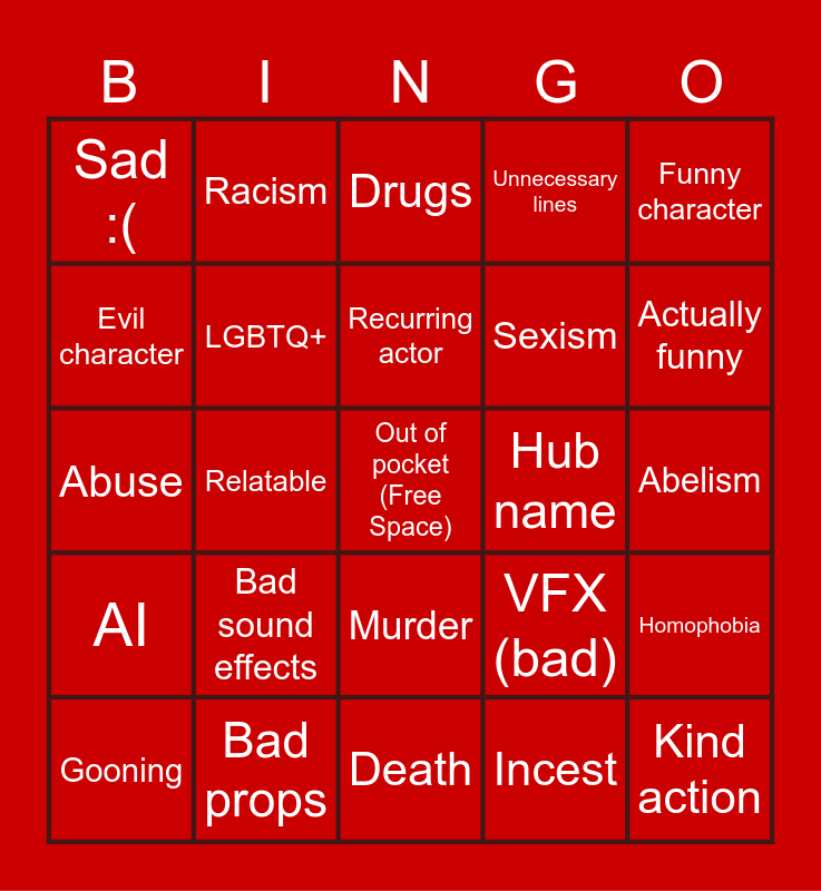 This bingo card has a free space and 34 words: Pedo, Bad acting, Supernatural, Slur, Abelism, Evil character, LGBTQ+, Death, Sexism, Kind action, Abuse, Racism, Incest, Hub plot, AI, Relatable, Murder, Hub name, Homophobia, Gooning, Bad props, !BOOM!, Unnecessary lines, Actually funny, Bonus free space, Bad sound effects, Drugs, Celebrity mention, Funny character, Sad :(, Really unfunny, Recurring actor, VFX (bad) and Gen Z slang.