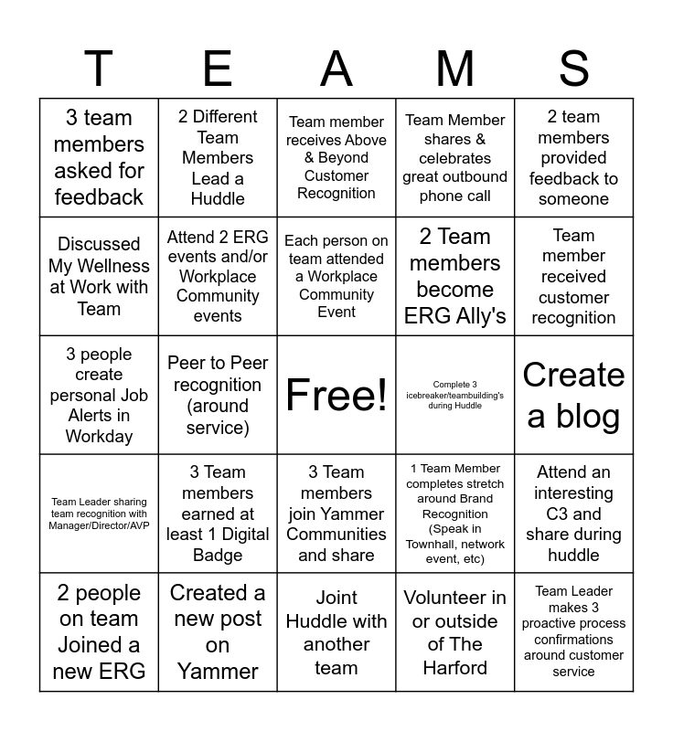 This bingo card has a free space and 24 words: 3 Team members earned at least 1 Digital Badge, Created a new post on Yammer, Each person on team attended a Workplace Community Event, 2 people on team Joined a new ERG, 2 team members provided feedback to someone, 3 team members asked for feedback, Discussed My Wellness at Work with Team, 2 Different Team Members Lead a Huddle, Complete 3 icebreaker/teambuilding's during Huddle, 3 Team members join Yammer Communities and share, 2 Team members become ERG Ally's, 3 people create personal Job Alerts in Workday, 1 Team Member completes stretch around Brand Recognition (Speak in Townhall, network event, etc), Attend an interesting C3 and share during huddle, Attend 2 ERG events and/or Workplace Community events, Volunteer in or outside of The Harford, Create a blog, Team member receives Above & Beyond Customer Recognition, Team member received customer recognition, Peer to Peer recognition (around service), Team Leader makes 3 proactive process confirmations around customer service, Team Leader sharing team recognition with Manager/Director/AVP, Team Member shares & celebrates great outbound phone call and Joint Huddle with another team.