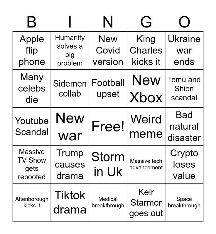 This bingo card has a free space and 24 words: Trump causes drama, Tiktok drama, Football upset, Attenborough kicks it, Ukraine war ends, Apple flip phone, Many celebs die, Humanity solves a big problem, Weird meme, Storm in Uk, New Xbox, Youtube Scandal, Massive tech advancement, Crypto loses value, Sidemen collab, Keir Starmer goes out, Bad natural disaster, New Covid version, Temu and Shien scandal, New war, Space breakthrough, Massive TV Show gets rebooted, King Charles kicks it and Medical breakthrough.