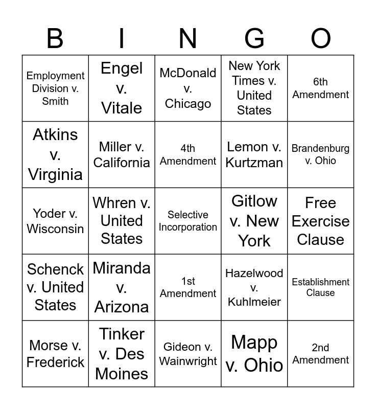This bingo card has a free space and 27 words: Hazelwood v. Kuhlmeier, 5th Amendment, Lemon v. Kurtzman, Gideon v. Wainwright, Atkins v. Virginia, McDonald v. Chicago, Engel v. Vitale, Schenck v. United States, Gitlow v. New York, Establishment Clause, Yoder v. Wisconsin, New York Times v. United States, Morse v. Frederick, Tinker v. Des Moines, Brandenburg v. Ohio, Texas v. Johnson, Miller v. California, 4th Amendment, Miranda v. Arizona, Employment Division v. Smith, Free Exercise Clause, Mapp v. Ohio, Whren v. United States, 2nd Amendment, 1st Amendment, 6th Amendment and 8th Amendment.