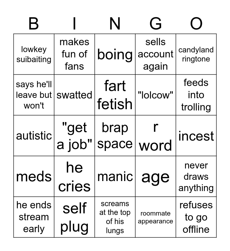This bingo card has a free space and 24 words: he cries, self plug, fart fetish, he ends stream early, candyland ringtone, lowkey suibaiting, says he'll leave but won't, makes fun of fans, r word, manic, "lolcow", autistic, age, never draws anything, swatted, roommate appearance, incest, boing, feeds into trolling, "get a job", refuses to go offline, meds, sells account again and screams at the top of his lungs.