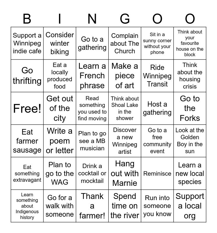 This bingo card has 36 words: Hang out with Marnie, Drink a cocktail or mocktail, Spend time on the river, Go thrifting, Eat farmer sausage, Think about Shoal Lake in the shower, Eat a locally produced food, Thank a farmer!, Sit in a sunny corner without your phone, Reminisce, Think about the housing crisis, Complain about The Church, Learn a new local species, Get out of the city, Make a piece of art, Support a Winnipeg indie cafe, Eat something extravagant, Host a gathering, Free!, Go to a gathering, Read something you used to find moving, Write a poem or letter, Discover a new Winnipeg artist, Plan to go see a MB musician, Go to a free community event, Consider winter biking, Ride Winnipeg Transit, Go for a walk with someone, Learn a French phrase, Think about your favourite house on the block, Support a local org, Learn something about Indigenous history, Look at the Golden Boy in the sun, Go to the Forks, Plan to go to the WAG and Run into someone you know.