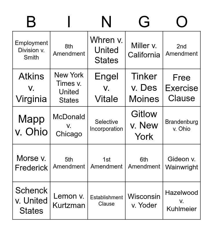 This bingo card has a free space and 27 words: 6th Amendment, Miranda v. Arizona, Tinker v. Des Moines, Establishment Clause, Atkins v. Virginia, Whren v. United States, 8th Amendment, Morse v. Frederick, Gitlow v. New York, Gideon v. Wainwright, Mapp v. Ohio, Miller v. California, Schenck v. United States, Lemon v. Kurtzman, Free Exercise Clause, Texas v. Johnson, New York Times v. United States, Engel v. Vitale, 5th Amendment, Employment Division v. Smith, Brandenburg v. Ohio, Wisconsin v. Yoder, McDonald v. Chicago, Hazelwood v. Kuhlmeier, 1st Amendment, 2nd Amendment and 4th Amendment.