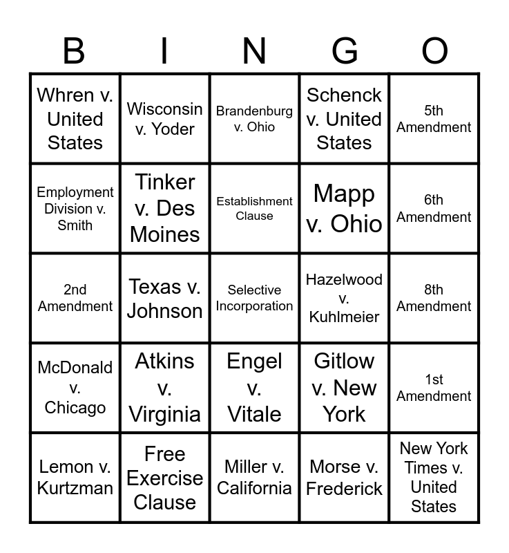 This bingo card has a free space and 27 words: Gitlow v. New York, Gideon v. Wainwright, Mapp v. Ohio, Miller v. California, Employment Division v. Smith, Brandenburg v. Ohio, Wisconsin v. Yoder, McDonald v. Chicago, Hazelwood v. Kuhlmeier, 1st Amendment, 2nd Amendment, Schenck v. United States, Lemon v. Kurtzman, Free Exercise Clause, 6th Amendment, Miranda v. Arizona, Tinker v. Des Moines, Establishment Clause, Atkins v. Virginia, Whren v. United States, 8th Amendment, Morse v. Frederick, Texas v. Johnson, New York Times v. United States, Engel v. Vitale, 5th Amendment and 4th Amendment.