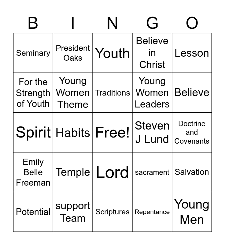 This bingo card has a free space and 54 words: Girls Camp, Emily Belle Freeman, Church, Lifelong Disciple of Jesus Christ, Lord, Belong With Christ, Believe in Christ, Become Like Christ, For the Strength of Youth, Patriarchal Blessing, Seminary, Intentional, support Team, Potential, Atonement, Scriptures, Young Men, Young Women Leaders, Young Women, Doctrine and Covenants, sacrament, Prayer/Pray, Steven J Lund, Lesson, Bishop, President Oaks, President Uchtdorf, President Nelson, Holy Ghost, Repentance, Baptism, Faith, Jesus Christ, Fasting, Youth, Covenant, Spirit, Salvation, Exaltation, Young Women Theme, Standard, Church Magazines, Service, Ministering, Temple, Saints, Fun, Family, Traditions, Habits, Believe, Study, Counsel and Foundation.