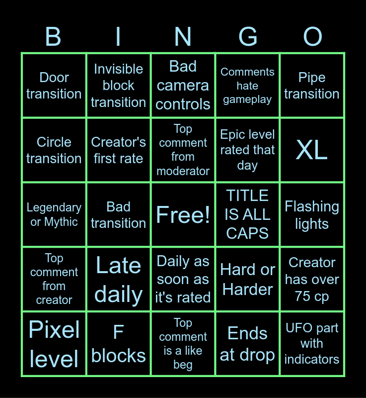 This bingo card has a free space and 25 words: Late daily, Top comment is a like beg, Top comment from moderator, Pixel level, Pipe transition, Door transition, Circle transition, Invisible block transition, TITLE IS ALL CAPS, Daily as soon as it's rated, Epic level rated that day, Legendary or Mythic, Hard or Harder, Creator has over 75 cp, Creator's first rate, RobTop comment, Flashing lights, Bad camera controls, XL, Bad transition, UFO part with indicators, F blocks, Top comment from creator, Comments hate gameplay and Ends at drop.