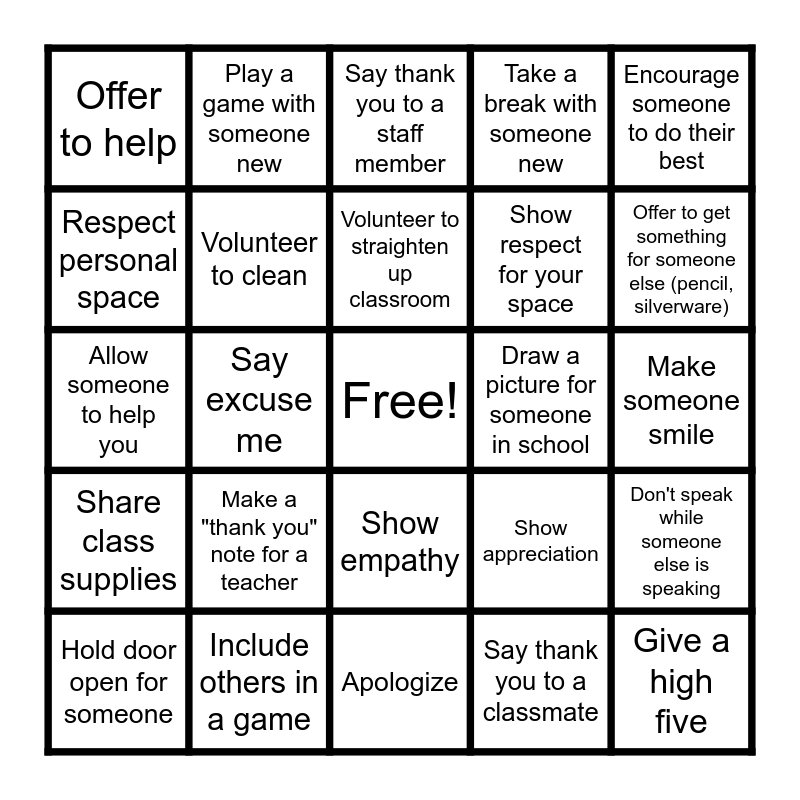 This bingo card has a free space and 29 words: Hold door open for someone, Give a genuine compliment, Say excuse me, Show active listening when someone else is speaking, Offer to help, Say thank you to a staff member, Volunteer to clean, Make a "thank you" note for a teacher, Draw a picture for someone in school, Include others in a game, Make someone smile, Give a high five, Apologize, Say thank you to a classmate, Offer to get something for someone else (pencil, silverware), Use good sportsmanship, Show empathy, Share class supplies, Encourage someone to do their best, Allow someone to help you, Show appreciation, Congratulate someone, Show respect for your space, Respect personal space, Take a break with someone new, Play a game with someone new, Don't speak while someone else is speaking, Volunteer to straighten up classroom and Read with a classmate.
