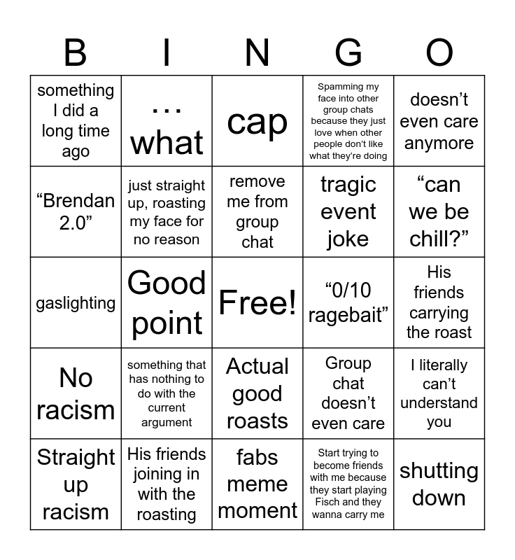This bingo card has a free space and 29 words: Straight up racism, Avoiding, Good point, Just straight up dumb, something I did a long time ago, cap, just straight up, roasting my face for no reason, something that has nothing to do with the current argument, “0/10 ragebait”, His friends joining in with the roasting, His friends carrying the roast, shutting down, fabs meme moment, Start trying to become friends with me because they start playing Fisch and they wanna carry me, “can we be chill?”, Doesn’t even try, Actual good roasts, No racism, doesn’t even care anymore, gaslighting, Group chat doesn’t even care, gets back up roasters, tragic event joke, “Brendan 2.0”, Spamming my face into other group chats because they just love when other people don’t like what they’re doing, … what, I literally can’t understand you, remove me from group chat and Everyone in the group chat talking at once so I can’t even understand anybody.