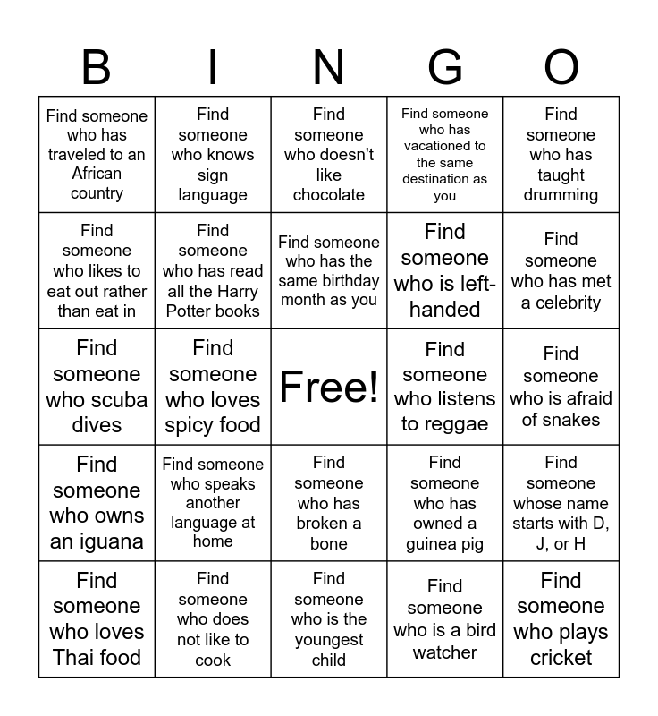 This bingo card has a free space and 24 words: Find someone who loves Thai food, Find someone who speaks another language at home, Find someone who has the same birthday month as you, Find someone who is a bird watcher, Find someone who has taught drumming, Find someone who has traveled to an African country, Find someone who knows sign language, Find someone who doesn't like chocolate, Find someone who listens to reggae, Find someone who is afraid of snakes, Find someone who scuba dives, Find someone who has read all the Harry Potter books, Find someone who has owned a guinea pig, Find someone whose name starts with D, J, or H, Find someone who likes to eat out rather than eat in, Find someone who does not like to cook, Find someone who is the youngest child, Find someone who has vacationed to the same destination as you, Find someone who has met a celebrity, Find someone who owns an iguana, Find someone who loves spicy food, Find someone who has broken a bone, Find someone who is left-handed and Find someone who plays cricket.