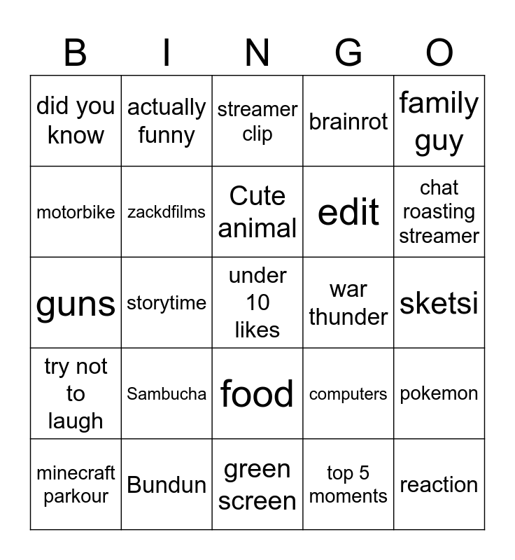 This bingo card has a free space and 24 words: Sambucha, Bundun, Cute animal, minecraft parkour, family guy, did you know, motorbike, actually funny, war thunder, food, edit, guns, computers, pokemon, zackdfilms, top 5 moments, sketsi, streamer clip, chat roasting streamer, storytime, reaction, try not to laugh, brainrot and green screen.
