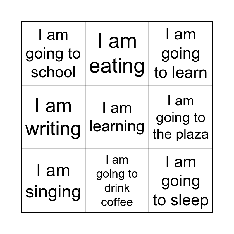 This bingo card has a free space and 8 words: I am going to the plaza, I am going to learn, I am eating, I am singing, I am going to school, I am going to sleep, I am writing and I am going to drink coffee.