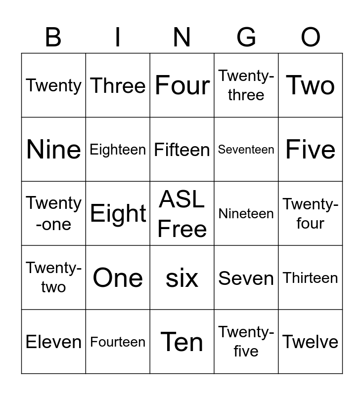 This bingo card has a free space and 25 words: One, Ten, Fifteen, Eleven, Two, Twenty, Nine, Three, Nineteen, six, Seventeen, Twenty -one, Seven, Thirteen, Eighteen, Sixteen, Twenty-four, Four, Five, Eight, Twelve, Fourteen, Twenty-two, Twenty-three and Twenty-five.
