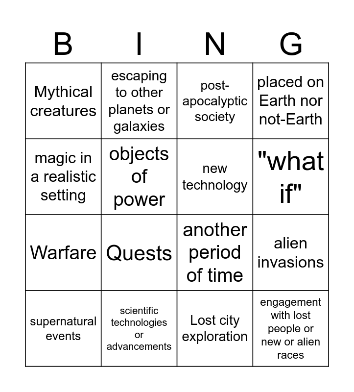 This bingo card has 16 words: scientific technologies or advancements, alien invasions, post-apocalyptic society, Mythical creatures, Warfare, escaping to other planets or galaxies, another period of time, Lost city exploration, magic in a realistic setting, objects of power, supernatural events, placed on Earth nor not-Earth, Quests, "what if", new technology and engagement with lost people or new or alien races.
