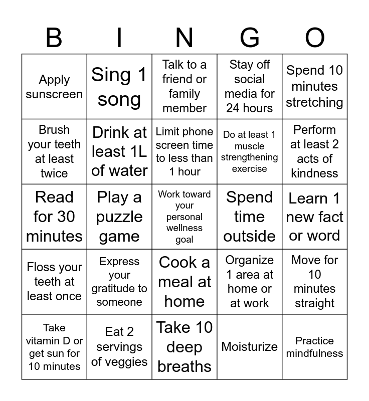 This bingo card has a free space and 24 words: Express your gratitude to someone, Eat 2 servings of veggies, Limit phone screen time to less than 1 hour, Take vitamin D or get sun for 10 minutes, Spend 10 minutes stretching, Apply sunscreen, Brush your teeth at least twice, Sing 1 song, Spend time outside, Cook a meal at home, Do at least 1 muscle strengthening exercise, Read for 30 minutes, Organize 1 area at home or at work, Move for 10 minutes straight, Drink at least 1L of water, Moisturize, Learn 1 new fact or word, Talk to a friend or family member, Perform at least 2 acts of kindness, Play a puzzle game, Practice mindfulness, Floss your teeth at least once, Stay off social media for 24 hours and Take 10 deep breaths.