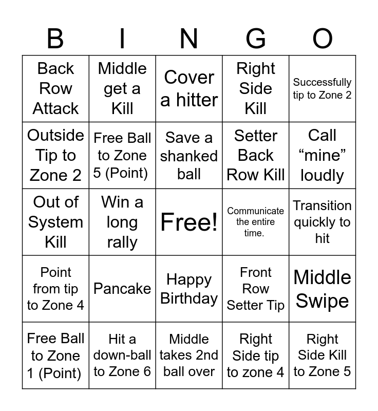 This bingo card has a free space and 33 words: Outside get a Kill, Score a point off a free ball, Win a long rally, Get a block touch, Point from tip to Zone 4, Free Ball to Zone 5 (Point), Successfully tip to Zone 2, Free Ball to Zone 1 (Point), Middle get a Kill, Setter Dump, Save a shanked ball, Cover a hitter, Pass set hit 3 times in a row, Middle gets a kill to Zone 1, Communicate the entire time., Call “mine” loudly, Hit a down-ball to Zone 6, Out of System Kill, Pancake, Front Row Setter Tip, Happy Birthday, Get a Block, Back Row Attack, Transition quickly to hit, Middle takes 2nd ball over, Right Side Kill to Zone 5, Right Side Kill, Setter Back Row Kill, Outside Tip to Zone 2, Middle Swipe, Setter pulls ball out of the net, Right Side tip to zone 4 and Middle Back stays deep.