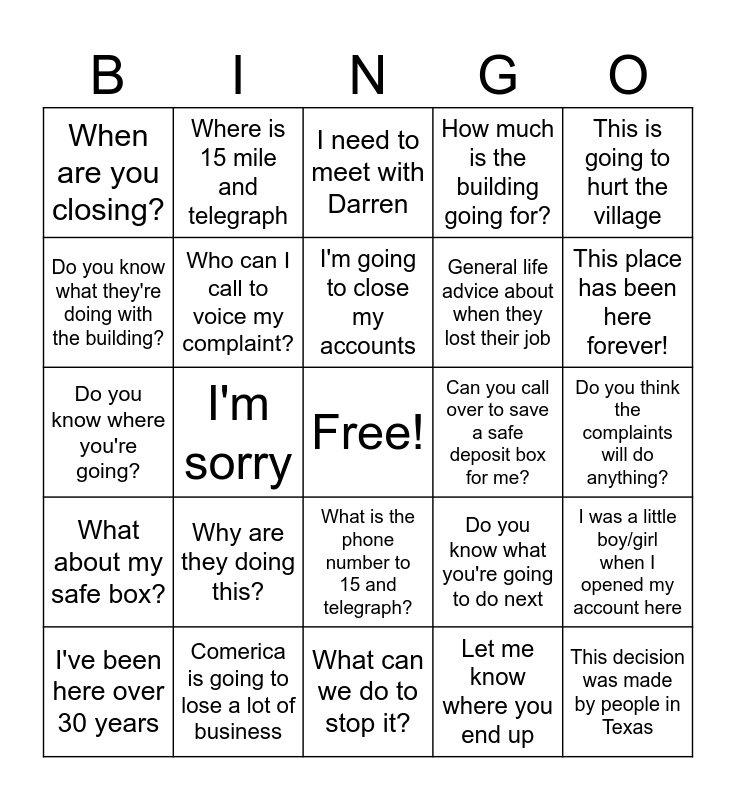 This bingo card has a free space and 24 words: I've been here over 30 years, Why are they doing this?, I'm going to close my accounts, Let me know where you end up, This is going to hurt the village, When are you closing?, Where is 15 mile and telegraph, I need to meet with Darren, Can you call over to save a safe deposit box for me?, Do you think the complaints will do anything?, Do you know where you're going?, Who can I call to voice my complaint?, Do you know what you're going to do next, I was a little boy/girl when I opened my account here, Do you know what they're doing with the building?, Comerica is going to lose a lot of business, What can we do to stop it?, How much is the building going for?, This place has been here forever!, What about my safe box?, I'm sorry, What is the phone number to 15 and telegraph?, General life advice about when they lost their job and This decision was made by people in Texas.