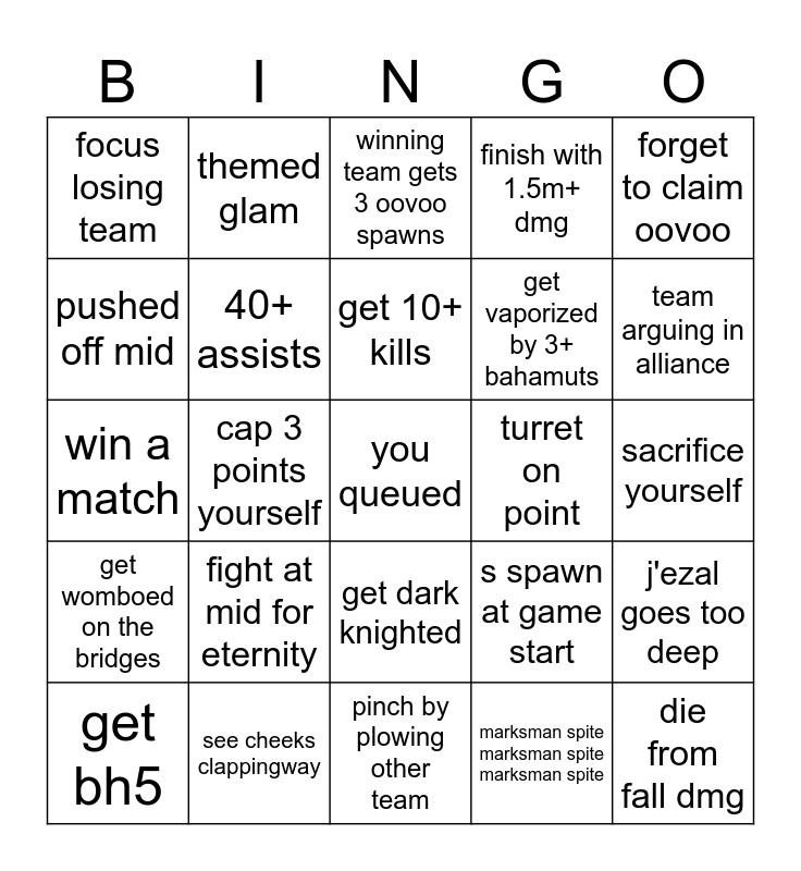 This bingo card has a free space and 24 words: fight at mid for eternity, see cheeks clappingway, get 10+ kills, get bh5, forget to claim oovoo, focus losing team, pushed off mid, themed glam, turret on point, get dark knighted, get vaporized by 3+ bahamuts, win a match, s spawn at game start, j'ezal goes too deep, 40+ assists, marksman spite marksman spite marksman spite, sacrifice yourself, winning team gets 3 oovoo spawns, team arguing in alliance, cap 3 points yourself, die from fall dmg, get womboed on the bridges, finish with 1.5m+ dmg and pinch by plowing other team.