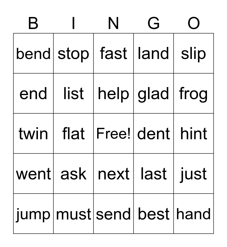 This bingo card has a free space and 24 words: ask, must, help, jump, slip, bend, end, stop, dent, next, glad, twin, last, just, list, best, hint, fast, frog, flat, hand, went, land and send.