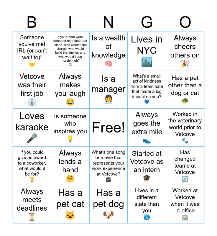 This bingo card has a free space and 24 words: Always lends a hand π€, Has a pet cat π±, Is a manager π©βπΌ, Always meets deadlines β³, Always cheers others on π, Someone you've met IRL (or can't wait to)! π€, Vetcove was their first job π, If your team were stranded on a deserted island, who would take charge, who would build the shelter, and who would keep morale high? ποΈ, Always goes the extra mile π, Whatβs one song or movie that represents your work experience at Vetcove? π¬, What's a small act of kindness from a teammate that made a big impact on you? π, Loves karaoke π€, Started at Vetcove as an intern π, Has changed teams at Vetcove π, Always makes you laugh π, Lives in a different state than you π, Worked in the veterinary world prior to Vetcove πΎ, Is a wealth of knowledge π§ , Has a pet other than a dog or cat π’, Is someone who inspires you π‘, Worked at Vetcove when it was in-office π’, If you could give an award to a coworker, what would it be for? π, Lives in NYC ποΈ and Has a pet dog πΆ.
