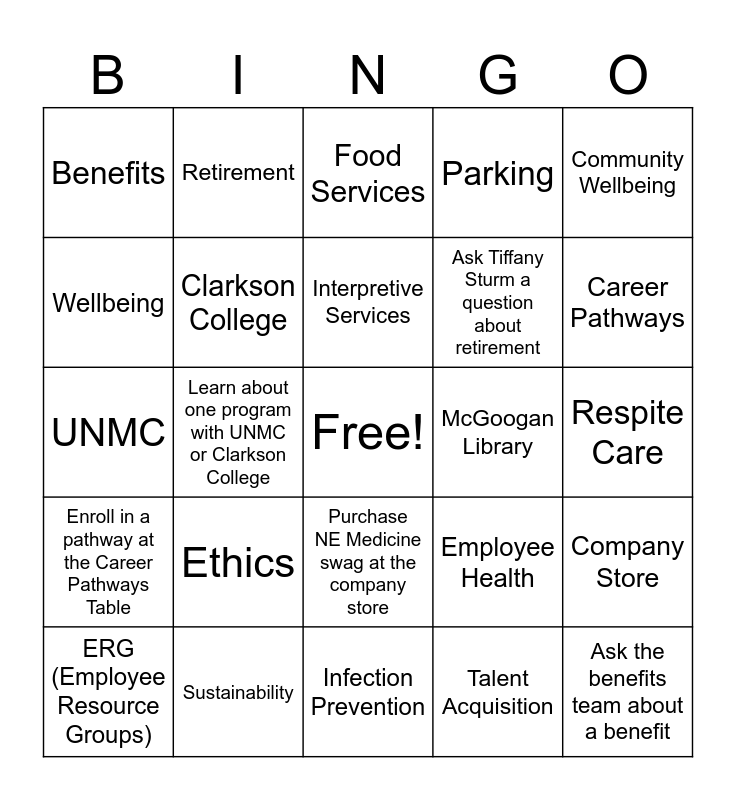 This bingo card has a free space and 24 words: ERG (Employee Resource Groups), Ethics, Interpretive Services, Talent Acquisition, Community Wellbeing, Benefits, Retirement, Food Services, McGoogan Library, Respite Care, UNMC, Clarkson College, Employee Health, Company Store, Wellbeing, Sustainability, Infection Prevention, Parking, Career Pathways, Enroll in a pathway at the Career Pathways Table, Learn about one program with UNMC or Clarkson College, Purchase NE Medicine swag at the company store, Ask Tiffany Sturm a question about retirement and Ask the benefits team about a benefit.