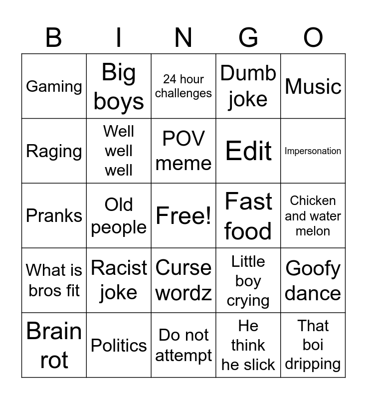 This bingo card has a free space and 24 words: Racist joke, Politics, POV meme, Brain rot, Music, Gaming, Raging, Big boys, Fast food, Curse wordz, Edit, Pranks, Little boy crying, Goofy dance, Well well well, He think he slick, Chicken and water melon, 24 hour challenges, Impersonation, Old people, That boi dripping, What is bros fit, Dumb joke and Do not attempt.
