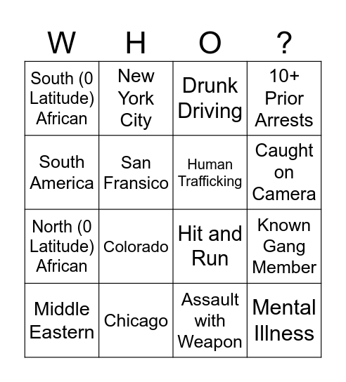 This bingo card has 28 words: Central America, Detroit, Assault with Weapon, Homeless, South America, New York City, Drunk Driving, Known Gang Member, North (0 Latitude) African, Chicago, Sexual Assault, 10+ Prior Arrests, Asia Major, Los Angeles, Murder, 15+ Prior Arrests, European, San Fransico, Hit and Run, Mental Illness, South (0 Latitude) African, Portland, Armed Robbery, Caught on Camera, Middle Eastern, Colorado, Human Trafficking and Drug User.