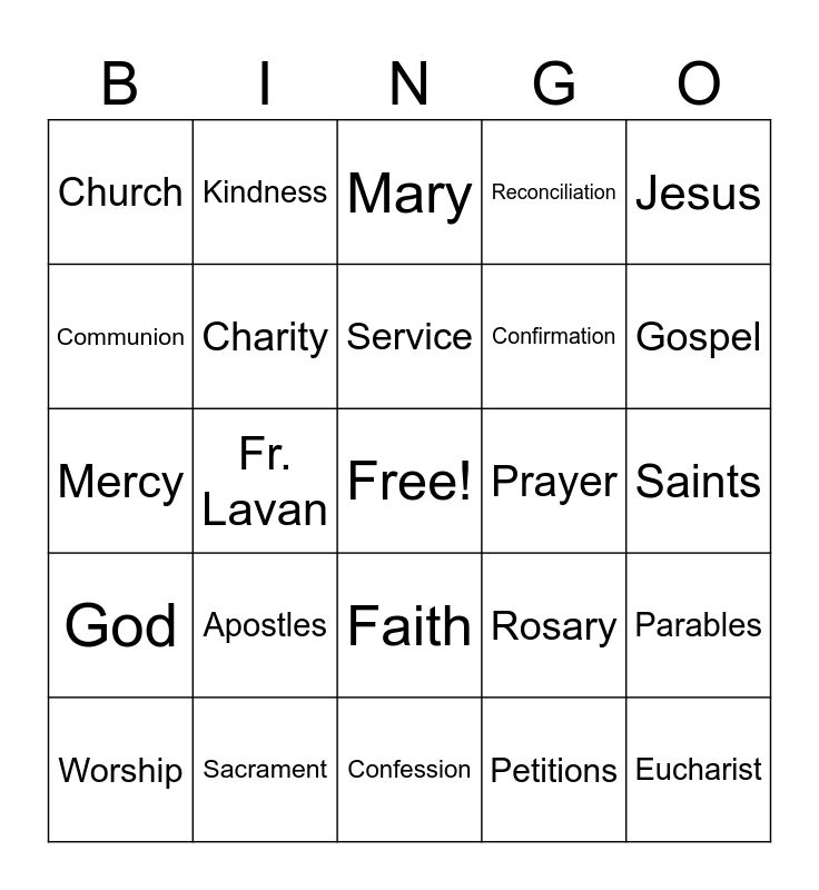 This bingo card has a free space and 33 words: Mass, Bible, Fr. Lavan, Joseph, God, Charity, Jesus, Worship, Kindness, Pope, Service, Mary, Values, Teachers, Prayer, Gospel, Sacrament, Mercy, Apostles, Rosary, Faith, Baptism, Church, Saints, Confession, Eucharist, Reconciliation, Confirmation, Communion, Parables, Psalms, Petitions and Intentions.