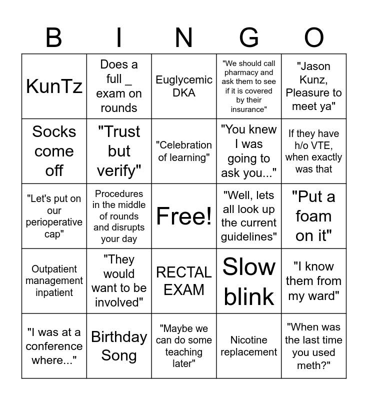 This bingo card has a free space and 24 words: "They would want to be involved", Birthday Song, "Celebration of learning", "I was at a conference where...", "Jason Kunz, Pleasure to meet ya", KunTz, Socks come off, Does a full _ exam on rounds, "Well, lets all look up the current guidelines", RECTAL EXAM, "You knew I was going to ask you...", "Let's put on our perioperative cap", Slow blink, "I know them from my ward", "Trust but verify", Nicotine replacement, "Put a foam on it", Euglycemic DKA, If they have h/o VTE, when exactly was that, Procedures in the middle of rounds and disrupts your day, "When was the last time you used meth?", Outpatient management inpatient, "We should call pharmacy and ask them to see if it is covered by their insurance" and "Maybe we can do some teaching later".